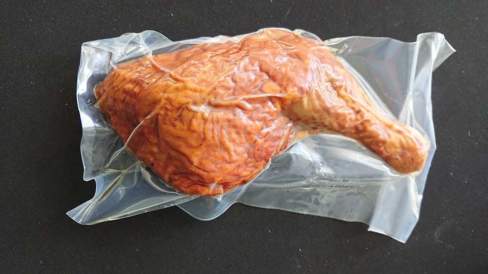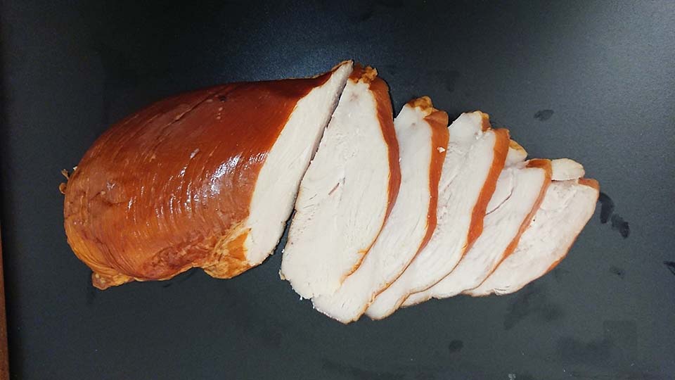 Een mager stukje kipvlees ambachtelijk en diep gerookt.